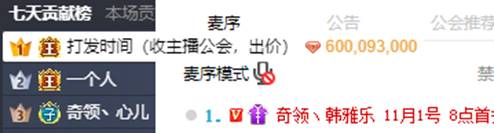 昨天是韩雅乐加入奇领公会首秀的日子,晚上8点他准时开通了连麦,神豪发哥早早就现身韩雅乐的直播间,并一直豪刷礼物,飞机一架接着一架,也吸引了众多网友们的围观,直播间的热度高涨,瞬间发哥就刷出了60万的Y币直接秒榜。
